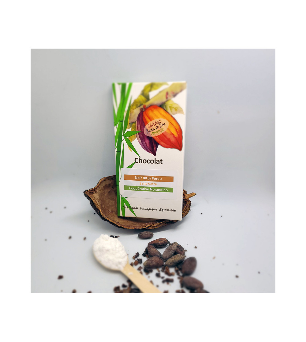 Dégustez un chocolat sain et gourmand, il est fabriqué avec à 80% de fèves de cacao de la coopérative Norandino au Pérou et 20% de sirop d'agave.