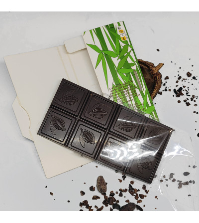 Ce chocolat bean to bar est fabriqué dans notre atelier avec des fèves de cacao* et du sucre de canne*.