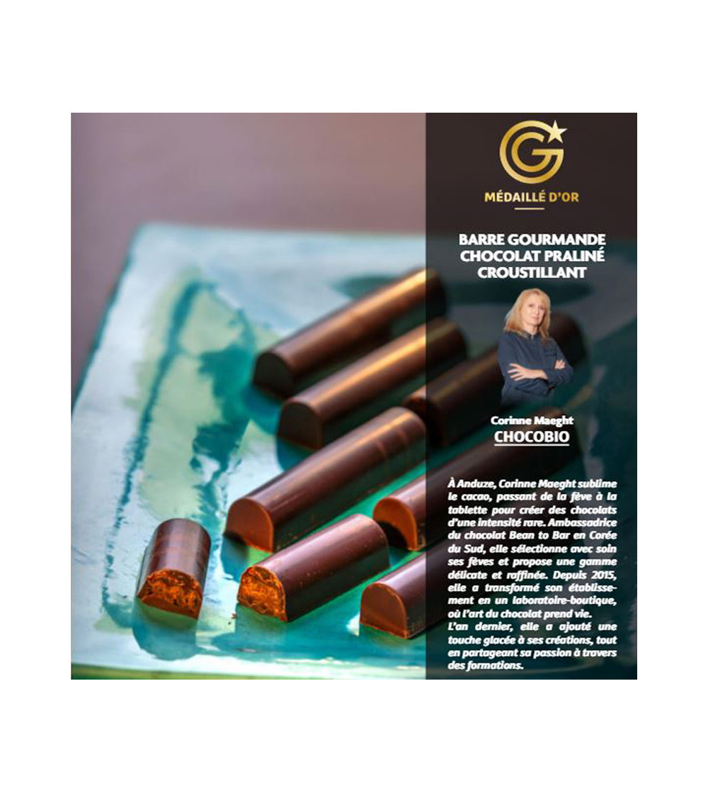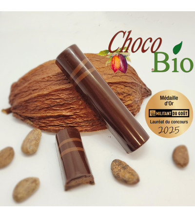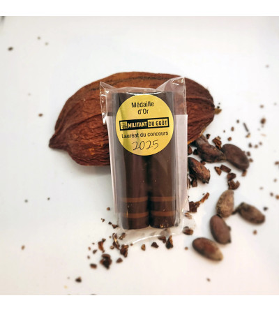 Laissez vous séduire par ces deux barres gourmandes chocolat noir d'Equateur 71% médaille d'Or 2025. Elles sont fourrée avec un praliné de noisettes croustillant et un caramel beurre salé.