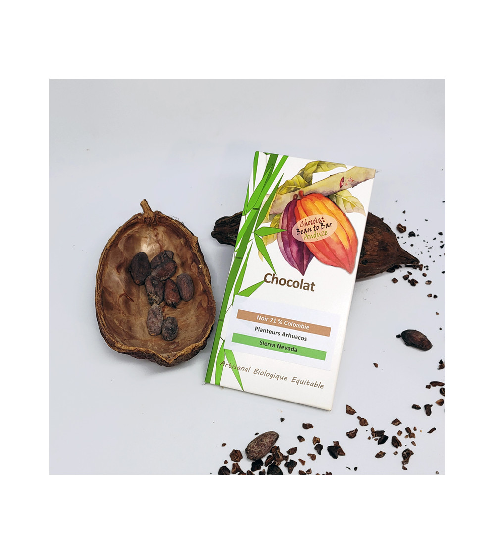 Dégustez ce chocolat 71% de Colombie. Ce chocolat est fabriqué avec les fèves des planteurs Arhuacos, cette ethnie indigène vit au nord de la Colombie dans la Sierra Nevada de Santa Marta, elle vie et produit en harmonie avec la nature. Le chocolat fabriqué à partir de leurs fèves développe des arômes gourmands, on y retrouve des notes chocolatées avec des nuances de citronnelle, panéla, réglisse et fruits brun.